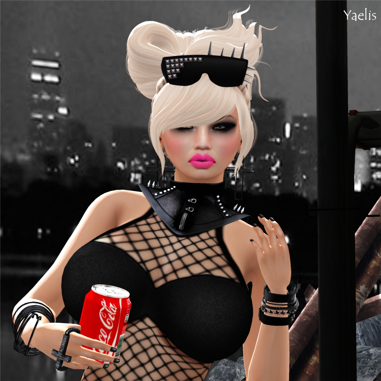 earrings, collar, shoes, spiked sunglasses & dark eyeshadow!